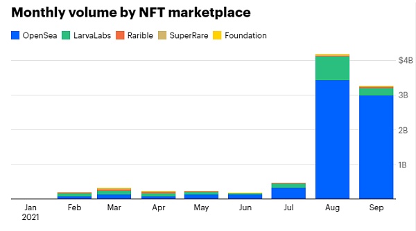 XRP/HKD-2.53%2020 年,超過 2 億美元的 NFT 易手。今年 2 月的銷量超過了去年全年,銷售額為 3.4 億美元。然后 8 月打破了所有記錄,頂級市場 Opensea 的 NFT 總交易量超過40 億美元。當您將以太坊以外的平臺考慮在內時,僅第三季度的二級銷售額可能就超過 了 100 億美元。