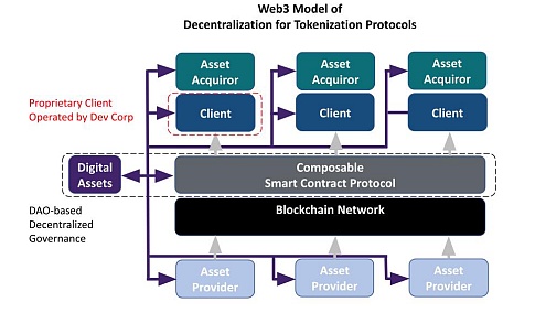 在這個模型中,考慮到輸入(資產提供者)和輸出(資產收購者)的足夠多樣性,以及通證化資產流經的層(即區塊鏈、智能合約和客戶)的去中心化,可以實現經濟去中心化. DAO 可以使用明確的激勵措施(可替代的代幣獎勵,無傭金/費用)來激勵資產提供者向系統提供資產,激勵客戶在代幣化資產中做市,以及收購者獲取或消費此類資產。雖然最初的開發公司最初可能在這些角色中的任何一個(資產提供者、客戶運營商、資產收購者)中發揮重要作用,但一旦系統去中心化,開發者最終將只是任何給定角色的眾多參與者之一。這將限制其產生的任何重大信息不對稱的風險,并減少對其管理工作的依賴。此外,DAO 和/或 subDAO 可以承擔許多角色。