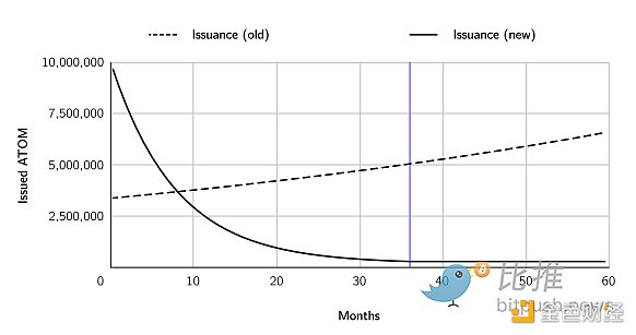 在過渡階段開始時,每月發行 1,000 萬枚 ATOM,大約是 40% 的年化通脹率。但每個月都會減少,最終在穩定期是每月 30 萬枚 ATOM,大約是 1% 的年化通貨膨脹率。當「質押率低于特定值」時,ATOM 會恢復原來的貨幣政策以確保安全。