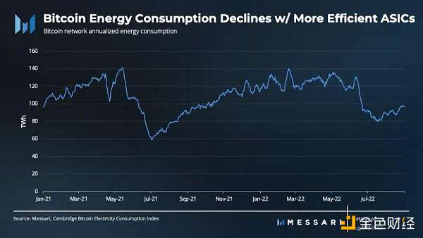 與 2022 年第二季度相比,估計能耗僅增加了 2%,而算力增加了 6%,并達到了歷史新高。原因可能是由于新的 ASIC 礦機更節能且具有更高的算力。