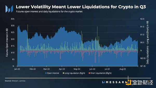 比特幣價格在第三季度逐漸復蘇,波動性呈下降趨勢。8 月份的 30 天平均波動率為 60%,而 6 月份則超過 80%。較低的比特幣波動性導致更廣泛的加密市場的清算減少。8 月份的多頭清算總額為 50 億美元,不到 6 月份(108 億美元)的一半。空頭清算總額也顯著降低,8 月份為 35 億美元,而 6 月份為 66 億美元。