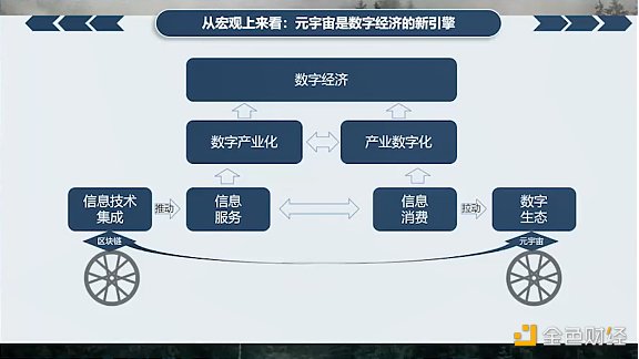 元宇宙是一個龐大的數字生態,這個數字生態能吸引更多用戶進行信息消費,從而促進產業數字化,并進一步通過產業數字化和數字產業化的提升來推動數字經濟的發展。在這個過程中,不難發現區塊鏈以及新一代信息技術是基礎設施,而元宇宙是一個數字的消費生態,通過“一個推動、一個拉動”來共同促進數字經濟的發展。