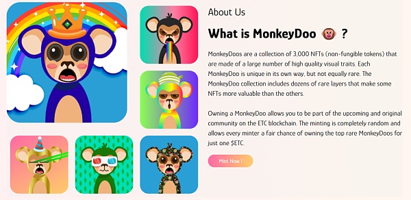 ETC 鏈上原生 NFT,在 2022 年 8 月 26 日被添加入 ETC 官網生態系統合集中。MonkeyDoo NFT 總量為 3000,鑄造價為 1 ETH,目前已有約 50% 被鑄造;此外,MonkeyDoo 還在 ETH 主網上發布了 3D MonkeyDoo,銷售的利潤將與 ETC MonkeyDoo 持有者分享,其總量同為 3000,但時至今日僅有 2 個被鑄造,鑄造價格為 0.05 ETH。依據路線圖,還預計在 ETC 上啟動 MonkeyDoo Mutants 和開發一個商品商店,銷售商品利潤將與 ETC MonkeyDoo 持有者分享。