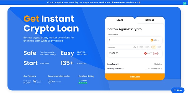 DeFi 借貸平臺,允許使用以 BTC、ETH、ADA、SOL、USDC、USDT 等 135 種選項作為抵押品獲得加密貸款;以及允許用戶使用 USDT(TRX、ETH、BSC)、USDC 和 BUSD 共五種穩定幣進行存款,提供 8% APY。