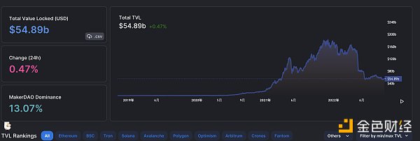 金色財經報道,據DefiLlama數據顯示,DeFi協議總鎖倉量(TVL)達到547.8億美元,24小時漲幅0.04%。TVL排名前五分別為MakerDAO(73.7億美元)、Lido(60.4億美元)、Curve(59.9億美元)、AAVE(56.6億美元)、Uniswap(52.3億美元)。