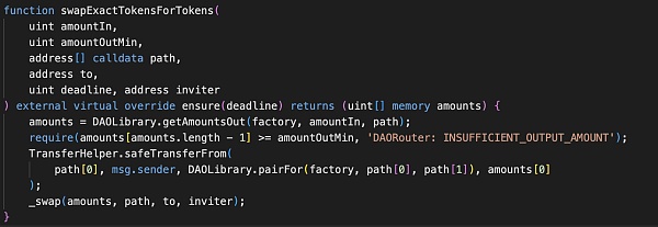在函數swapCall中,DAO代幣被轉移給用戶和邀請者,二者的地址都是通過參數傳遞的。