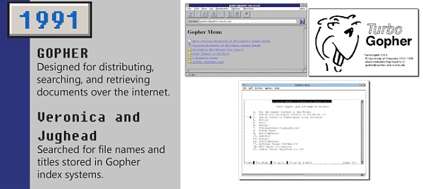 第一個基于內容的搜索協議: 同樣在 1991 年,第一個檢查文件內容而不僅僅是文件名的搜索協議被推出。像 HTTP 一樣,它是一個運行在 TCP/IP(互聯網)之上的應用層協議。它被稱為 Gopher(地鼠)。