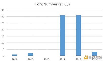 在?Forkdrop 收錄的有分叉事件的統計中,BTC 歷史上一共有過 68 次分叉,其中 62 次集中在 2017-2018這兩年。