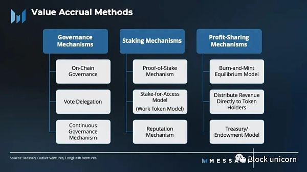 基本價值是由對協議服務的需求和協議的價值捕獲機制驅動的。Outlier Ventures和LongHash Ventures描述了如何通過各種機制來積累價值,包括但不限于: