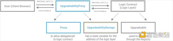 在這種模式中,代理合約往往是具有一些基本函數的最小化合約,大部分的業務邏輯都在邏輯合約里面完成,新的邏輯合約保持了最新的實現合約中存在的狀態變量的順序。代理合約一般需要所有者和實現變量來維持所有權和版本控制,代理合約將這些屬性指定為常量,它們被設置在合約的字節碼內。OpenZepplin在其可升級的合約服務中使用了非結構化的存儲模式。