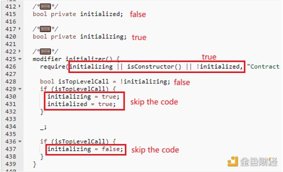 初始化函數執行到initializer時,從存儲插槽slot0的第1個8字節讀取initialized,其值為0,即false;從存儲插槽slot0的第2個8字節讀取initializing,其值為0x80ab6288 > 0,即true。