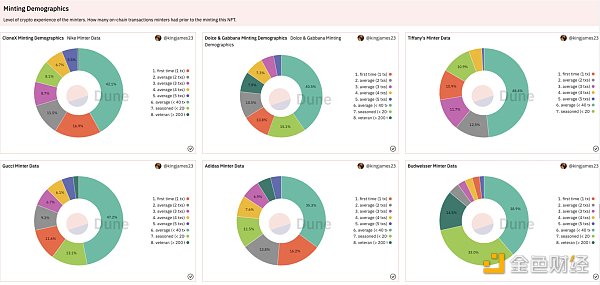 同時,作為一名 web3 沖浪者,我也非常歡迎 web2 品牌們進入 web3, 一起把 NFT 生態做大。一方面 PFP 之外需要有更多的敘事和 utility,正是經驗豐富的 web2 老手們可以發揮的戰場;另一方面傳統品牌的 web3 化,也是一個引入 web3 新用戶的過程。在那條 Nike 已產生超過 1.85 億美元的收入的新聞里,引用的 Dune Analytics 里面有一個非常有意思的數據,這些品牌 NFT 的 mint 用戶里,平均 40% 都是第一次 mint,可以認為是 NFT 新用戶。NFT 1 億用戶體量的大促,少不了源源不斷的 web2 品牌加入幫助。WAGMI!