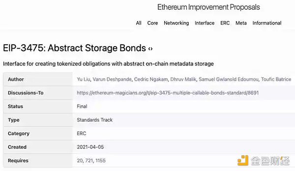 XRP/HKD-2.63%近日,由去中心化債券生態平臺 D/Bond 提交的《EIP-3475: Abstract Storage Bonds》提案獲得以太坊基金會通過。EIP-3475 作為一項應用標準提案,提供了一種新的 API 標準——ERC-3475。