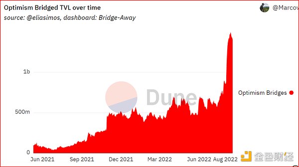 Dune 數據顯示,截止 8 月 17 日,Optimism Bridged TVL(跨鏈橋上停留的資產總額)達到近 14.27 億美元,而歷史最高值發生在 7 月 13 日的 14.95 億美元,也即目前跨鏈橋的 TVL 數據仍屬于歷史高位。