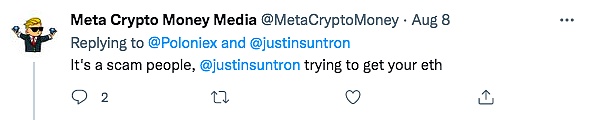 最先發聲且一步到位的上線了硬分叉代幣ETHW(ETH 1)當屬炒作者孫宇晨,在8月7日,Poloniex連發多條推特,聲稱自己是第一個支持分叉的交易所,并上架了ETHS和ETHW兩個代幣,并與孫宇晨頻繁互動。對此,V神評價到,ETHW的硬分叉支持者正在被“擁有交易所的人試圖快速賺錢”推動。而我們從推特下的評論中也可以感受到不買賬用戶居多,痛斥這是一場騙局。