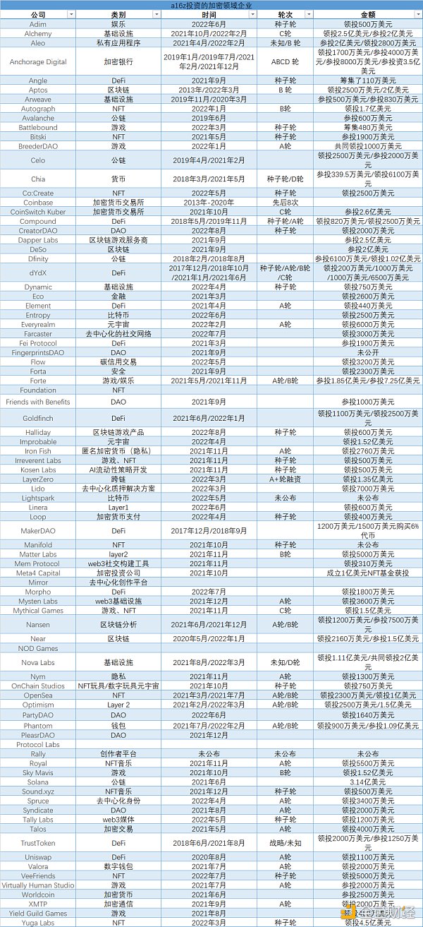 此外,加密貨幣交易所Coinbase、基于StarkEx的訂單簿模型去中心化衍生品交易平臺dYdX、NFT第一大交易平臺OpenSea、火遍全網絡的無聊猿所屬公司Yuga Labs、Web3基礎設施提供商Alchemy等公司,以及Solana、Uniswap、MakerDAO等明星項目,a16z都有攜重金入局或多次參投。