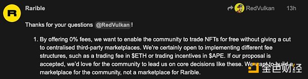 Rarible 選擇了完全 0% 的費用設置。不過,在后續回復社區用戶疑問時,Rarible 也表示對費用結構的設置完全由社區決定,如果社區希望為 APE 設置一定的費用激勵,那當然也可以。這個新市場是屬于?ApeCoin 社區的。