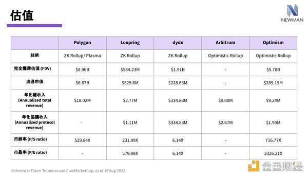 估值:在我們的研究中,我們比較了領先的 L2 公司的關鍵估值指標,發現 Polygon 在多個環節的表現都優于其同行,包括市值、收入和市銷率(P/S)。 截至 8 月 18 日,Polygon 的完全攤薄估值(FDV)是 Polygon 的首要競爭對手 Optimism 的 1.55 倍。此外,Polygon 的年化收入相當于 Aribtrum 和 Optimism 的總和,Polygon 和 Loopring 的 P/S 比率分別為 529.84 和 231.99,這意味著投資者認為在收取相同數量的收入時,Polygon 的價值大約是 Loopring 的 3 倍。