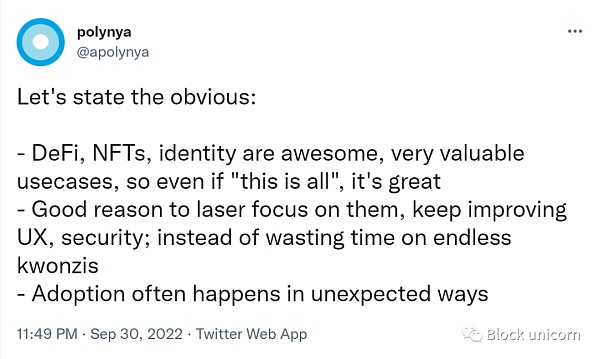 Polynya在上圖的推文里完美地框定了這篇帖子:到目前為止,我們到目前為止所做的可能就是我們使用區塊鏈所取得的全部成果。我們正在研究的技術要么徘徊在改變世界的邊緣,要么永遠停留在書呆子世界的邊緣。我們已經成功地吸引了全世界的注意力,但如果我們要采取行動并兌現承諾的話,我們需要迅速轉向,否則就會冒著走進我所說的以歐洲為中心的加密技術的死胡同的風險。
