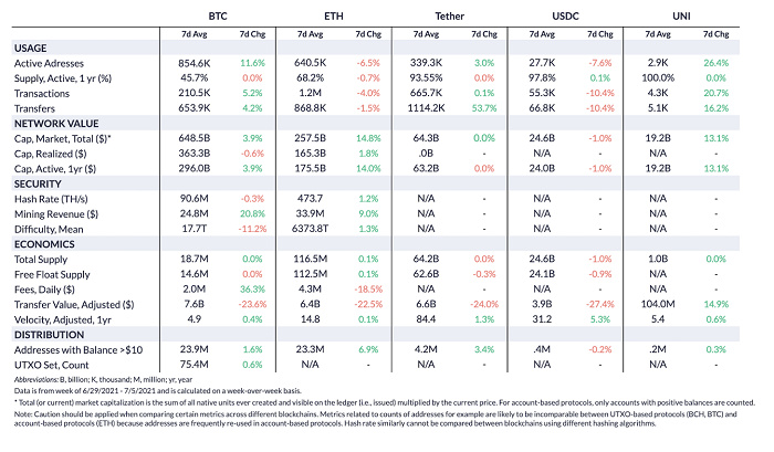 我們發現,比特幣活躍地址周環比增長了 11.6%,但與此同時,以太坊活躍地址卻下降 6.5%。在上周短暫超過比特幣之后,以太坊活躍地址數量沒有增加太多每日活躍地址,現在反而被比特幣再次超越。由于區塊之間的平均時間飆升,上周比特幣 的使用量有所下降,這導致添加到區塊鏈的比特幣區塊比平時少。區塊時間的增加可能是由于網絡算力下降導致,這可能會使開采的區塊數量減少。6 月 27 日,比特幣全網算力跌至 2019 年以來的最低水平后,但從上周開始,算力似乎開始逐漸趨穩。