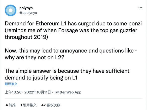 “由于一些 ponzi 項目,市場對以太坊 L1 的需求激增(讓我想起了 Forsage 在整個 2019 年是以太坊的頭號 gas 消耗者),現在,這可能會導致煩惱和問題,為什么它們不在 L2 上?