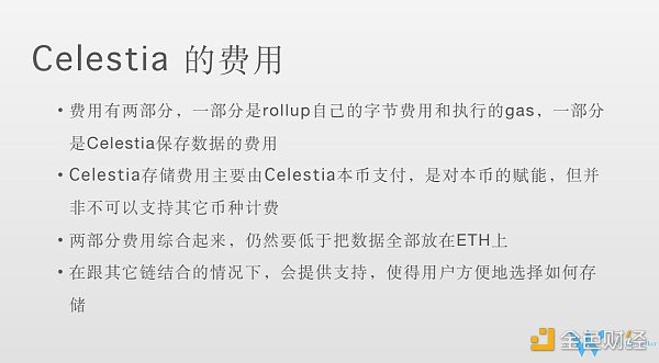 3)目標是做到兩部分的數據綜合起來也要比單獨把數據放在以太坊便宜。ETH是call data 比較貴。ETH做了danksharding之后,KZG 之后成本會更低。但是Celesita承諾費用更低。