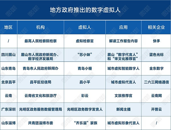 截至目前,已有云南省、山東青島市、山東淄博市、四川眉山市、北京昌平區、深圳光明區6個省市區的政府機構推出了虛擬人,應用在政務服務、文旅推廣、政策播報等領域。