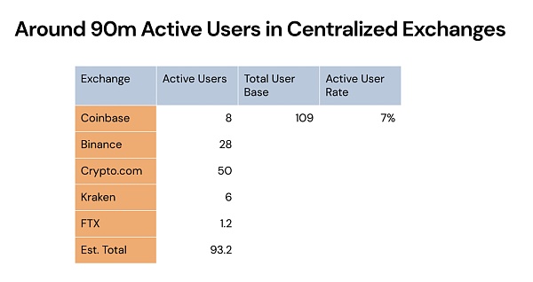 中心化交易所的活躍用戶下降到9320萬個。令人吃驚的是,活躍用戶數最多的居然是Crypto.com,而非Binance。