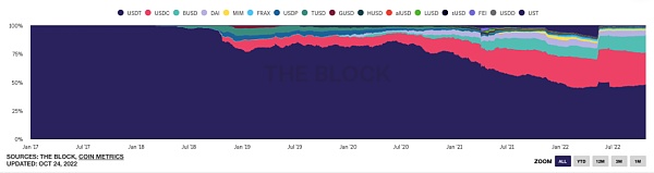Odaily 星球日報注:The Block 的穩定幣份額變化圖,紫色部分為 USDT,紅色部分為 USDC。