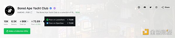 通常各個NFT平臺的地板價都因為平臺上掛出的具體NFT而有所不同。比如下方截圖中,LooksRare上掛出的BAYC系列地板價是73.88ETH。不過我們也可以看到LooksRare對比了Opensea的地板價,而Opensea的地板價實際上是72.69ETH。因此要更加準確地計算NFT地板價,就必須從多個平臺搜尋價格,并考慮市場分化因素。