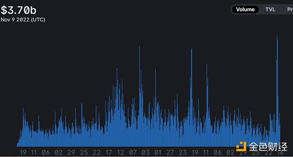 從數據上看,無論是 dYdX、GMX、Gains 這樣的鏈上衍生品項目,還是 Uniswap 這樣的傳統 DEX 協議,11 月 8 日都是一個關鍵的分水嶺——交易量開始相比前日大幅走高數倍,并且在隨后的 9 日、10 日左右創下歷史記錄,隨后開始逐步回落。