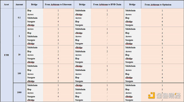 表 1 為不同數額大小的資產 ETH 從 Arbitrum 到 Ethereum、BNB Chain、Optimism 的跨鏈費用和到賬數額的情況,根據收集到的情況制作出了反映各跨鏈橋的排名情況,詳見表 2 。