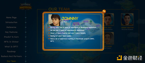 CTO Johnny,有超過 8 年的應用開發經驗。在區塊鏈有超過 3 年的經驗,超過 2 年的 Reactjs 和超過 3 年的 NodeJs 的經驗。有 2 - 5 年的團隊領導經驗,及豐富的區塊鏈項目(DeFi, NFT)工作經驗。