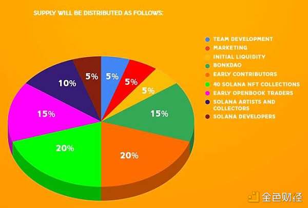 據官方介紹,Bonk 一共發行了 100 萬億 BONK 代幣,50% 的代幣空投給 Solana 社區,這包括 LamportDAO 的開發人員(LamportDAO 是 Solana 建設者的中心)、Famous Fox Federation 等 NFT 項目的持有者,甚至空投對象也包括此前宣布遷移至其他鏈的 DeGods 等。空投具體分配如下: