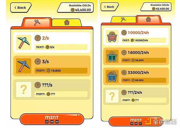 應用默認的挖礦效率為每秒挖出 1 枚 Gold,挖礦時間為 1h,單賬號上限為每 24h 產出 10000 枚 Gold。用戶可通過點擊 Tap 按鈕來提升挖礦效率,也可以鑄造挖礦效率更高的鋤頭。2HGT/s 效率的鋤頭鑄造價格為 9600 枚 Gold,3/s 效率的鋤頭鑄造價格為 19800 枚 Gold。同時可以提升礦車容量來提升每日可挖礦數量,16000/24h 礦車鑄造價格為 36000 枚 Gold,33000/24h 礦車鑄造價格為 68000 枚 Gold。