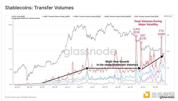 在 5 月、6 月以及 11 月的高波動性拋售事件期間,穩定幣總轉賬量在 370 億美元 和 510 億美元之間達到峰值,這表明在去杠桿化事件期間對美元流動性的極端需求。