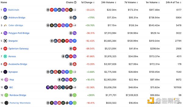 跨鏈橋中,Multichain流動性和交易量均位列第一,Wormhole的TVL最高下降94.6%。