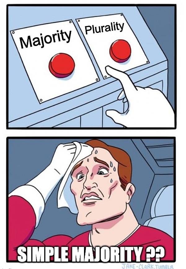如果有兩個以上的選項,多數投票可能無法選出獲勝者。假設候選人 A 獲得 40%,候選人 B 獲得 35%,候選人 C 獲得 25%,那么沒有候選人吸引了超過 50% 的選民。所以沒有相對多數。需要在前兩名候選人之間進行另一輪比賽才能得出結論。