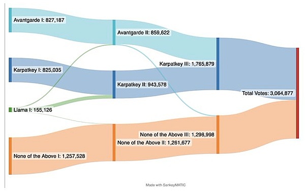 這種重新分配讓 Karpatkey 積累了比 Avantgarde 更多的選票,導致后者在第三輪被淘汰。現在 Karpatkey 得到了 Avantgarde 指定的選民,因為沒有其他候選人可用。請注意,即使這些選民沒有選擇 Karpatkey 作為他們的第二甚至第三選擇,Avantgarde 的選票是如何分配給 Karpatkey 的。這是排名選擇投票的一個突出問題,選民有時會感到受騙,因為他們的權重分配給了他們最終沒有偏好的候選人。