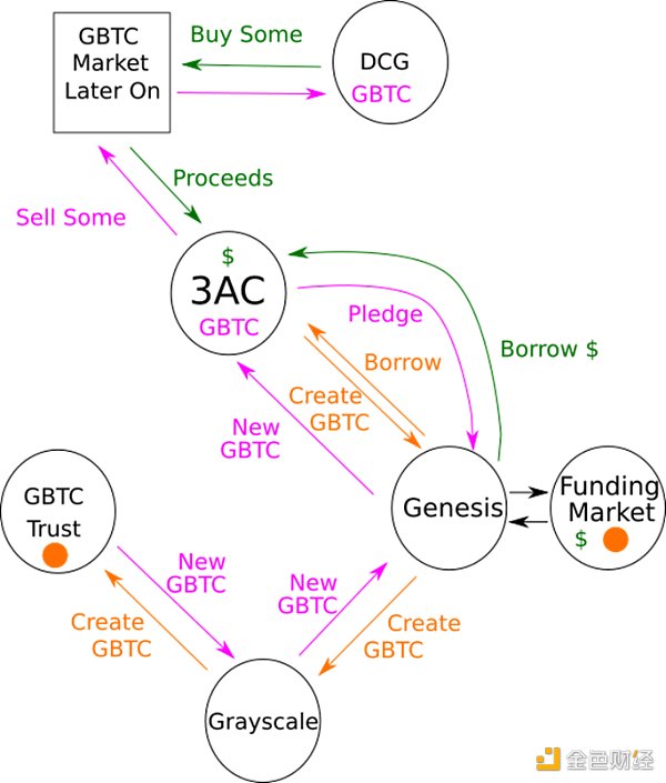 那么到這里我們先需要了解一個模型,由于GBTC與BTC的價格存在溢價,那就會出現獲利的機會,再結合“借”“化”“發”為一體的DCG集團,就會產生如下模型。