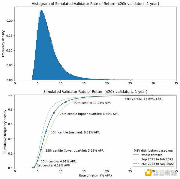 基于合并后向驗證者支付相同水平 MEV 的模型表明,驗證者的中位回報率為 6.1% APR(包括 MEV 和共識層獎勵),下四分位數為 5.3%,上四分位數為 7.3%。這是基于過去 6 個月的數據(2022 年 3 月至 2022 年 8 月)。