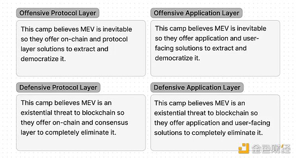 不論 MEV 所帶來的積極影響和消極影響誰大,但 MEV 始終是存在,特別是在合并后的區塊鏈世界。現在,鑒于對MEV及其它在區塊鏈中的生存方式的不同,也有不同的方法來面對MEV的影響。對MEV的分類和處理有幾種不同的方式。我們可以按照對MEV問題的認知和看法來進行劃分:
