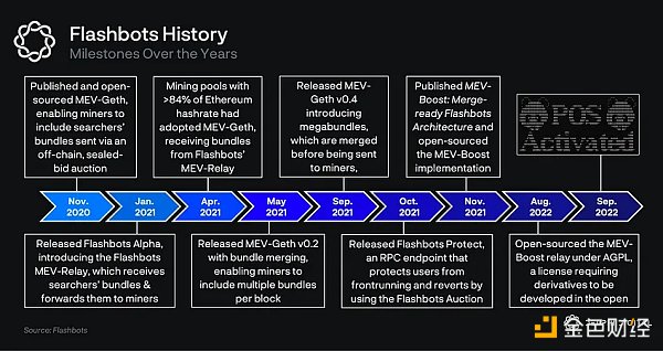 考慮到以太坊與權益證明的合并,Flashbots 拍賣轉向了mev-boost ,這是 PoS 以太坊提議者(proposer)與構建者(block builder)分離(PBS) 的實現。MEV-Boost 讓驗證者將區塊構建外包給競爭激烈的區塊構建者市場,并通過稱為中繼(relays)的服務接受最有利可圖的區塊構建,從而最大限度地減少 MEV 的負面影響。MEV-Boost增強了以太坊的安全性和去中心化,無論驗證者規模如何,都能使驗證者獲得支持PBS的MEV獎勵,而讓MEV不只有少數人的游戲。