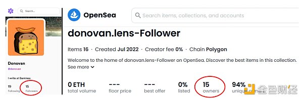 以Lenster為例,它是一個基于Lens協議的類似Facebook的應用程序。我在Lenster上總共有15位粉絲。這意味著Lenster上有15個很棒的人選擇了在我的Lenster個人資料上點擊“關注”,并鑄造一個Follow NFT。