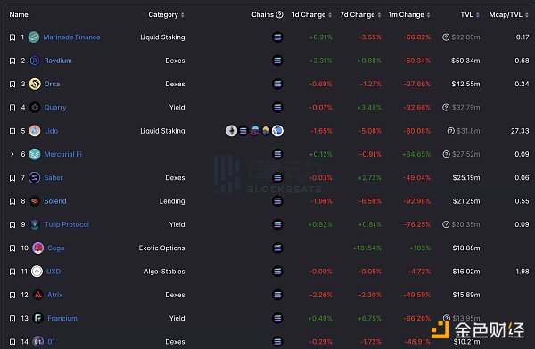 Solana 生態 TVL 驟降,各個 DeFi 協議的 TVL 都顯示持續流出。Solana 現在在其平臺上剩余 TVL 約為 2.9 億美元,與 3 個月前(2022 年 8 月 25 日 TVL 為 15 億美元)相比下降了約 80.6%,與峰值(2021 年 11 月 9 日峰值 TVL 為 101.7 億美元)相比下降了約 97.1%。主流的 DeFi 協議在過去一個月也出現了大量資金流出,Marinade、Lido 和 Raydium 的 TVL 都出現了 60% 以上的回撤。