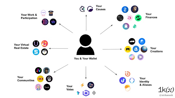 讓我們以錢包開始講起。雖然錢包仍然主要是在金融意義上的資產管理背景下思考的,但代幣化和鏈上歷史已經使我們能夠代表我們的利益(NFT 藏品),工作(Kudos,101)和意見(治理投票)。丟失私鑰正在變得不像丟失金錢,而更像是丟失護照或社媒賬戶。Crypto 模糊了我們擁有的東西和我們是誰之間的界限。