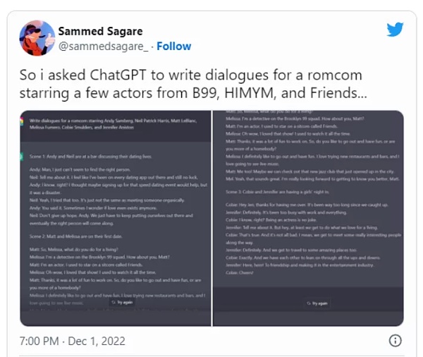 有人用《老友記》等喜劇演員為角色,讓它寫一些肥皂劇對白,結果惟妙惟肖: