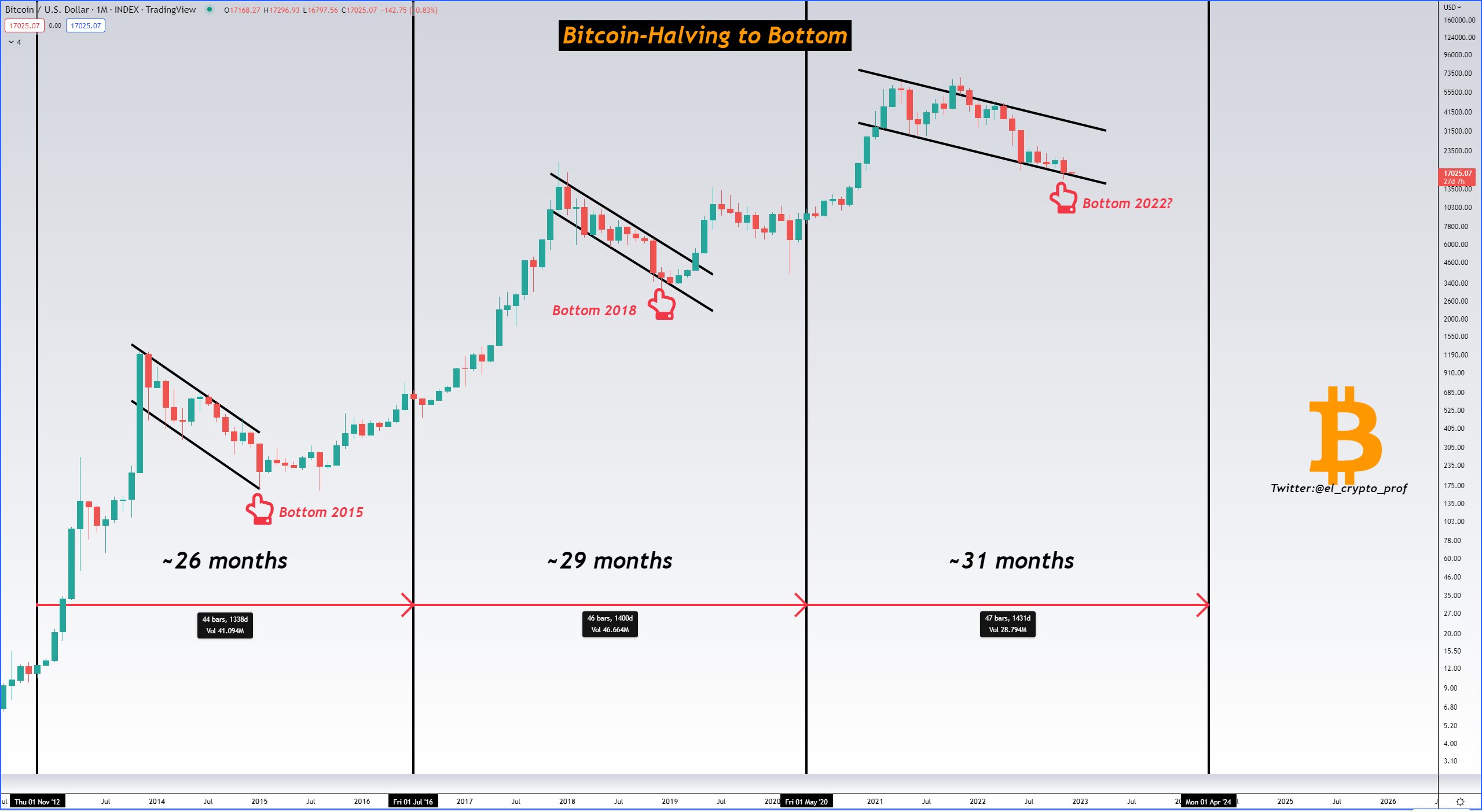 將2022年熊市與之前的熊市進行比較,他解釋道,BTC/USD現在應該正在尋找底部,距離上一個歷史高點已經過去了31周。