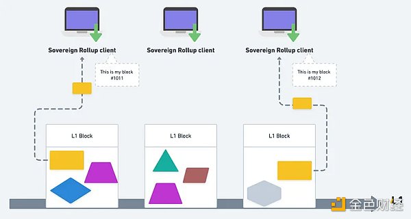 Sovereign Rollup 節點從 L1 資料中篩選出自己的區域,并解讀、算出最新狀態