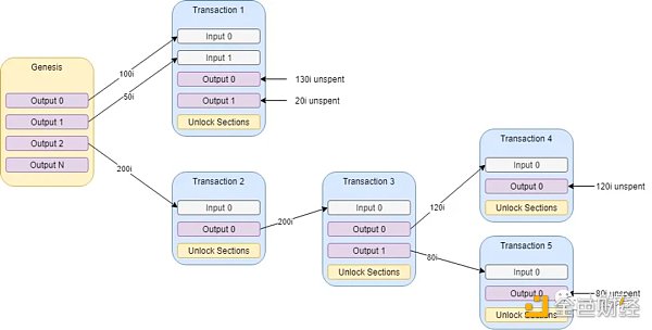 每一筆交易都由若干個輸入(Input) 和若干個 輸出(Output) 構成。每一筆交易都要花費一筆輸入,產生一筆輸出,而其所產生的輸出,就是“未花費過的交易輸出”;一個 Input 指向的是前面區塊的某個 Output,只有 Coinbase 交易沒有輸入,只有憑空輸出。